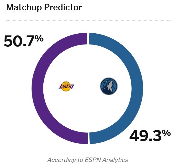 ESPN更新了兩支球隊G4的勝率,其中湖人50.7%略占優(yōu)勢,森林狼49.3%。